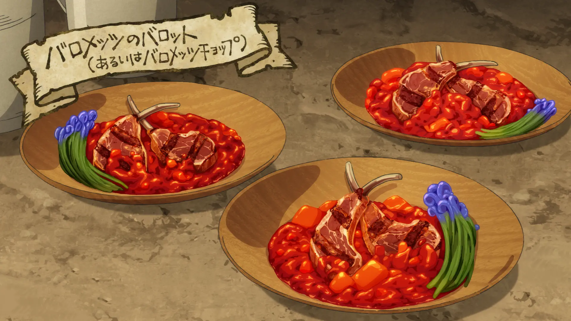 ライオスがチルチャックの本物と偽物を見分けるために、二人のチルチャックに料理してもらった料理。 料理の最中、チルBが無防備に木箱に座ったことで偽物と特定した。